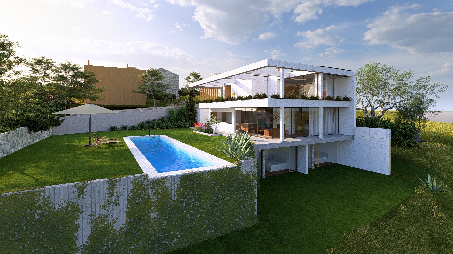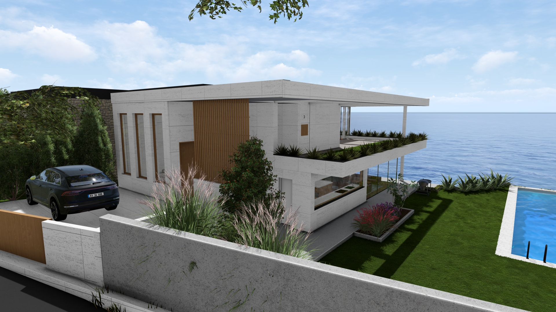 Izdelali smo projket / idejeno zasnovo družinske vile ob obali z bazenom. Objekt bo imel veliko steklenih površin z odprtimi pogledi proti morju, vinsko klet, savno v pritličnih delih ter druge zanimive rešitve.